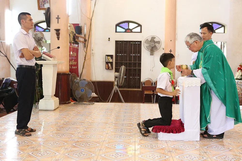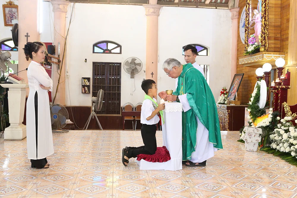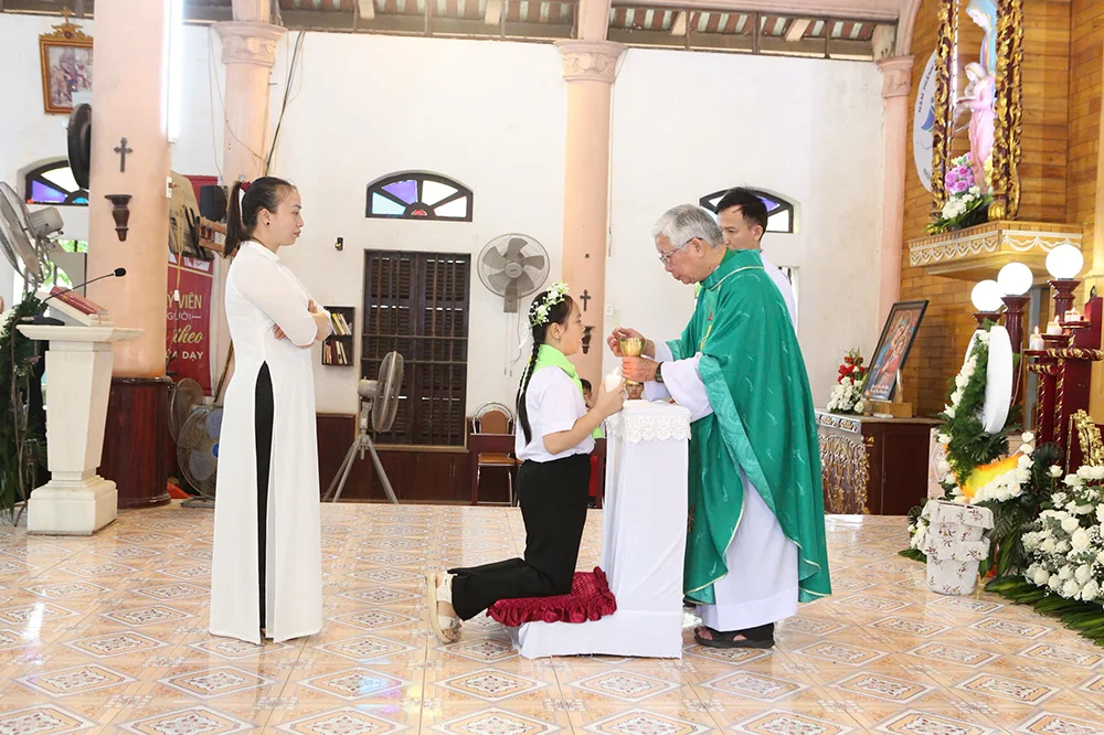 Sau đó, trong phần Phụng vụ Thánh Thể, 31 em thiếu nhi đã vui mừng tiến lên đón nhận Mình Máu Thánh Chúa Kitô lần đầu tiên, sau bao ngày mong chờ.
