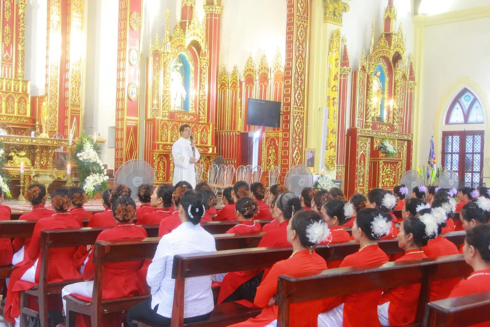 Vào lúc 14h00, cộng đoàn bước vào giờ chầu Thánh Thể trọng thể, cùng nhau dâng lên Chúa những lời tạ ơn, ngợi khen và cầu xin tha thiết. Sau giờ chầu, cha giáo Phanxicô Xaviê Ngô Quang Khải chia sẻ với cộng đoàn về ý nghĩa sâu xa của Năm Thánh, giúp mọi người nhận ra ân sủng dồi dào Thiên Chúa tuôn đổ qua Lòng Thương Xót của Người – nguồn mạch bình an và cứu độ cho toàn thể nhân loại.