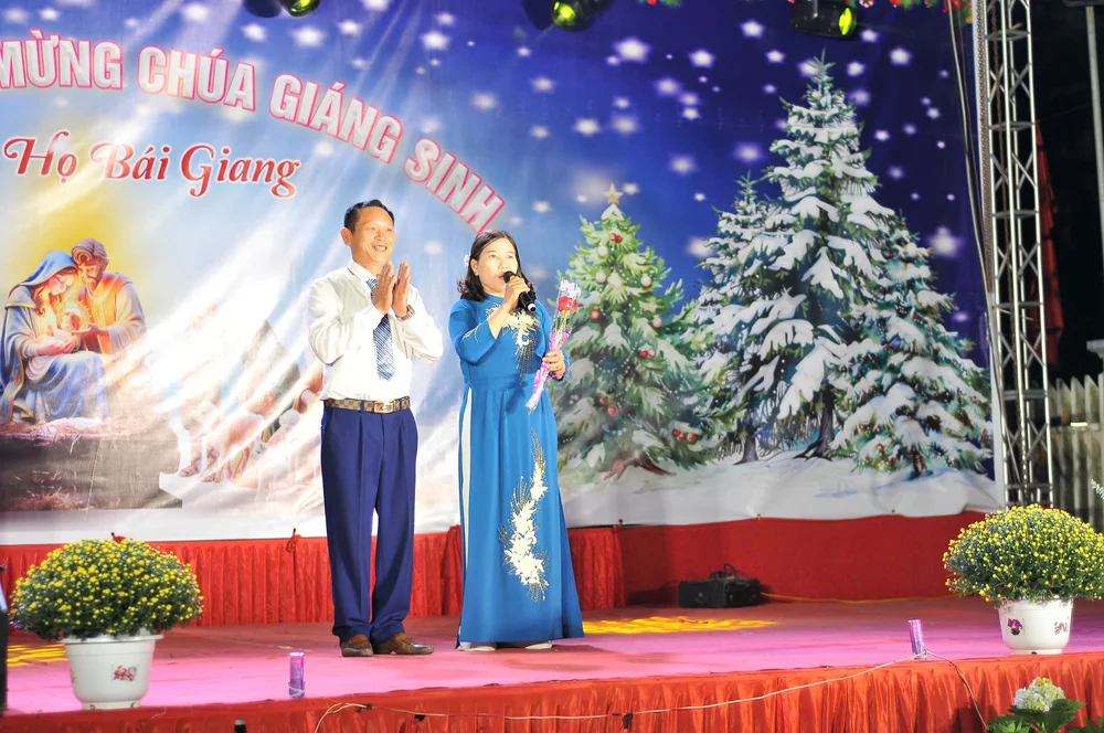 Sau Thánh lễ, Đêm Hoan ca Giáng Sinh chính thức diễn ra trong tiết trời se lạnh của vùng quê lúa, nhưng lòng người lại ấm áp lạ thường. Lời khai mạc của Cha Giuse vang lên nhẹ nhàng và sâu lắng, mở ra một đêm diễn thấm đượm tinh thần Giáng Sinh. Niềm vui của giáo họ thêm trọn vẹn khi đón nhận những bó hoa tươi thắm và sự hiện diện trân quý của Ban Hội đồng Giáo xứ, cùng đại diện Ban lãnh đạo xã Lương Tài và chính quyền thôn Bái Giang, thể hiện sự gắn kết tốt đẹp giữa Giáo họ và địa phương.