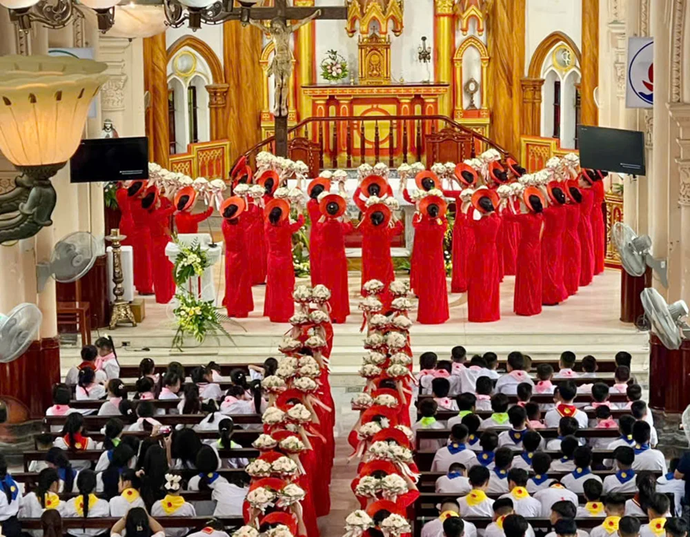 Sau đó, cộng đoàn cùng nhau tham dự giờ dâng hoa kính Đức Mẹ. Những tà áo đỏ thắm, những đoá hoa tươi cùng lời kinh sốt sắng đã làm bầu khí thêm phần linh thiêng và trang trọng.