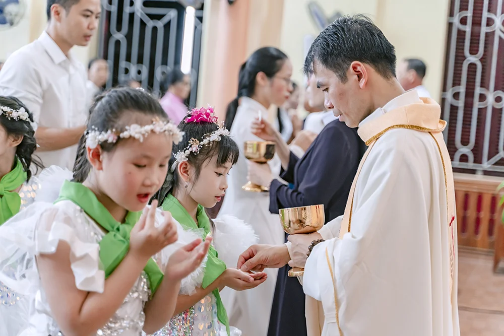 Tiếp đến là giây phút các em sốt sáng tiến đến gần gian cung Thánh, đón nhận Chúa Giêsu Thánh Thể lần đầu tiên với tâm tình đơn sơ, mong chờ. Đây là khoảnh khắc linh thiêng để lại nhiều xúc động cho phụ huynh, ban giáo lý và toàn thể cộng đoàn.