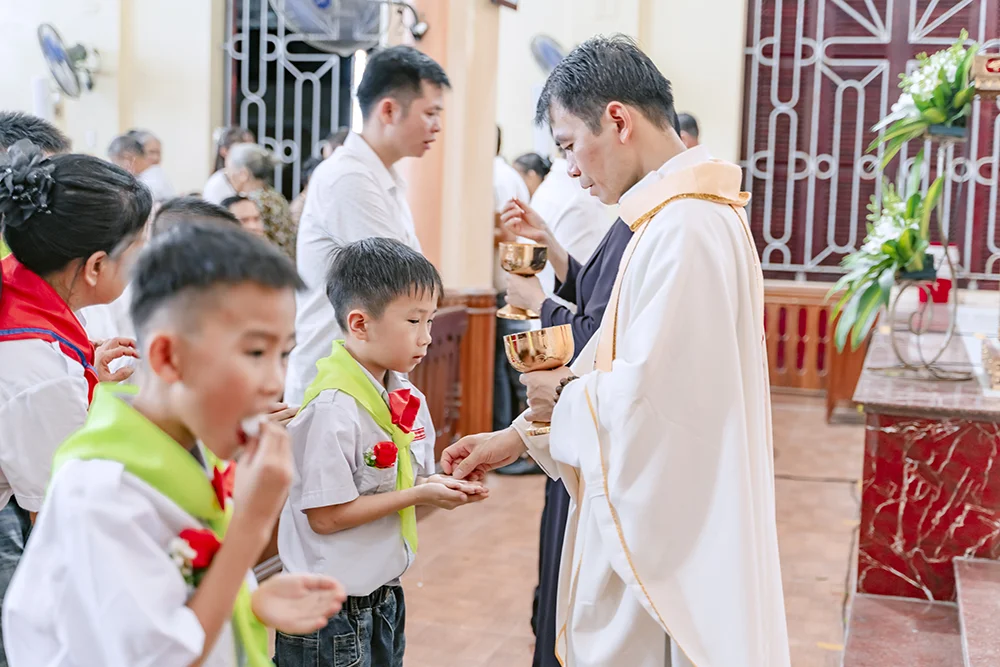 Thánh Lễ do cha xứ Giuse Đinh Văn Thành chủ sự, cùng với sự hiệp thông, quý tu sĩ, ban giáo lý và toàn thể cộng đoàn. Đây là một dấu mốc thiêng liêng và ý nghĩa trong hành trình đức tin của các em, khi lần đầu tiên được rước Mình và Máu Thánh Chúa Giêsu vào lòng.