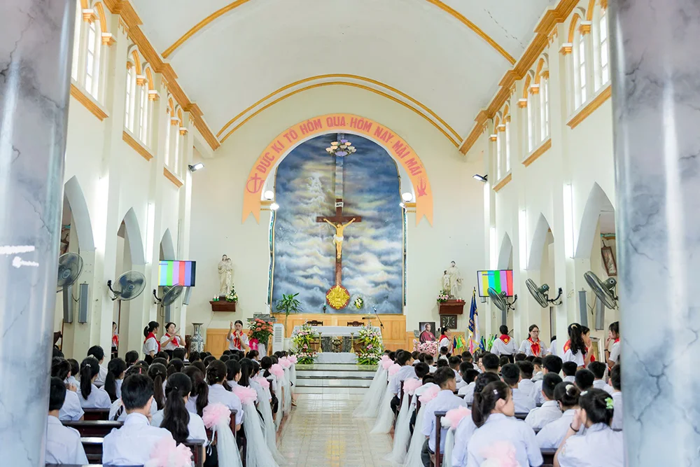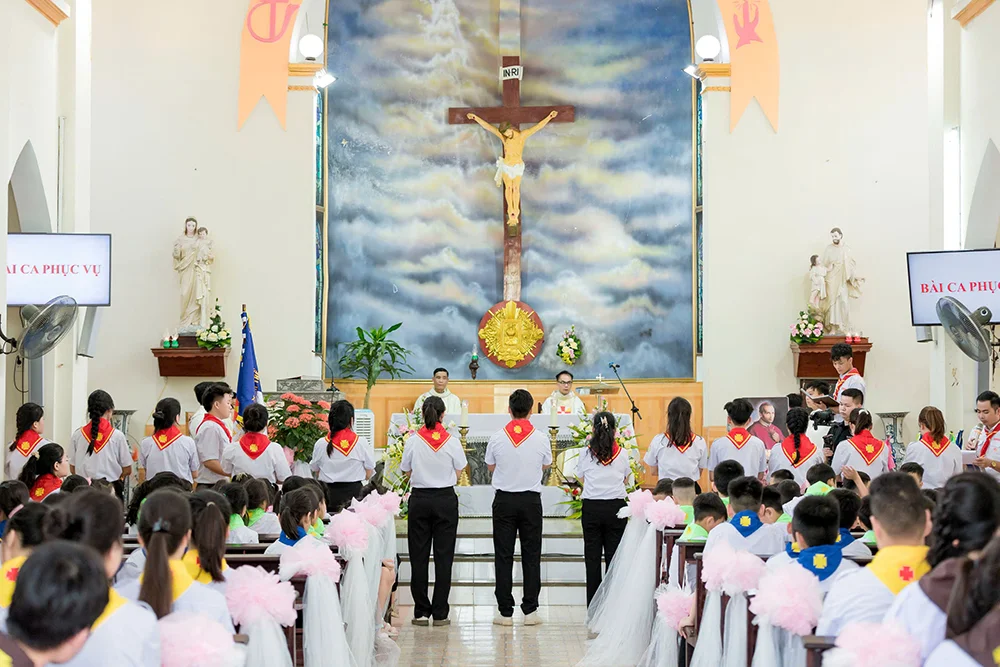 Sau các phần nghi thức, trong bầu khí đầy trang nghiêm và sốt sắng, quý Cha, quý Thầy, quý Sơ, quý Trưởng, các em thiếu nhi và cộng đoàn phụng vụ hiệp dâng Thánh lễ, cùng nhau lắng nghe Lời Chúa và hiệp thông nơi Bàn tiệc Thánh Thể.