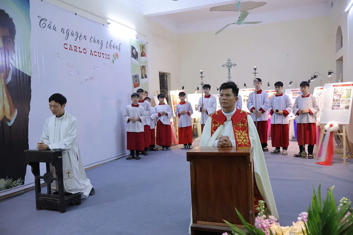 Kết thúc thánh lễ, cộng đoàn đã cùng đoàn nghi lễ rước Thánh Tích hạng nhất của Thánh Carlo Acutis vào trong nhà cầu nguyện để cộng đoàn tôn kính thánh nhân khi chiêm ngắm công trình triển lãm do chính ngài thực hiện.