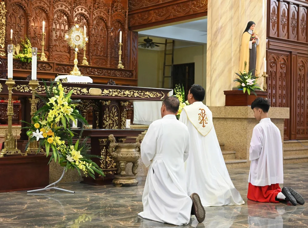 Sau phần công bố văn thư bổ nhiệm và tuyên xưng đức tin, cộng đoàn cùng hiệp thông trong nghi thức Chầu Thánh Thể do Cha Tân Chánh xứ chủ sự. Bầu khí linh thiêng và sốt sắng bao trùm ngôi thánh đường, như lời tạ ơn chân thành dâng lên Thiên Chúa – Đấng đã thương quy tụ và gìn giữ đoàn chiên Phúc Yên qua bao thế hệ.