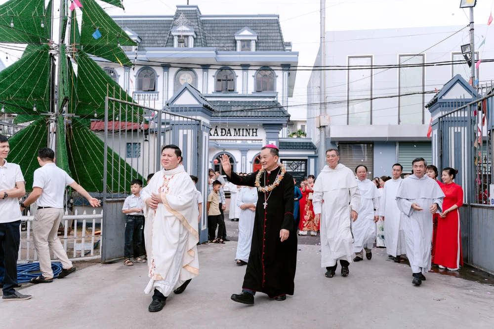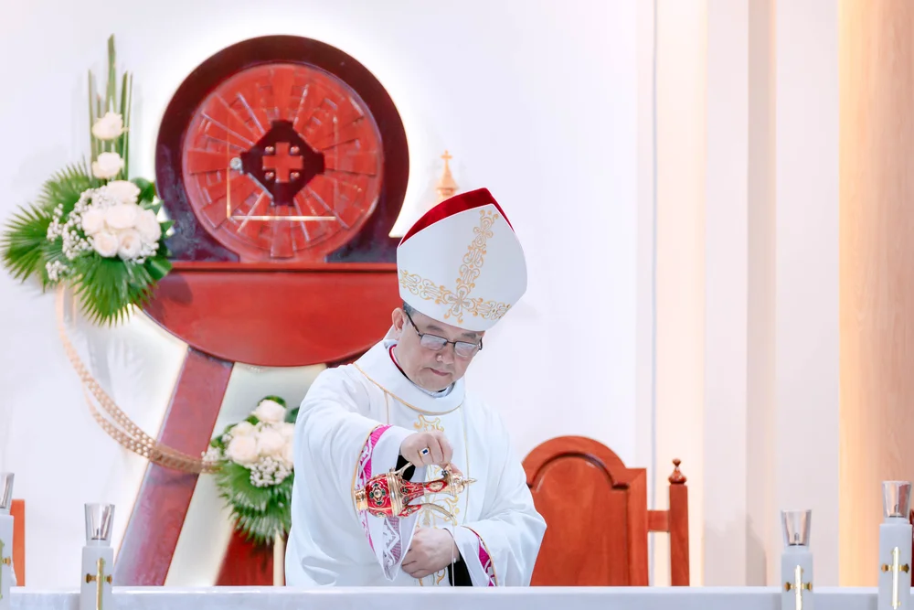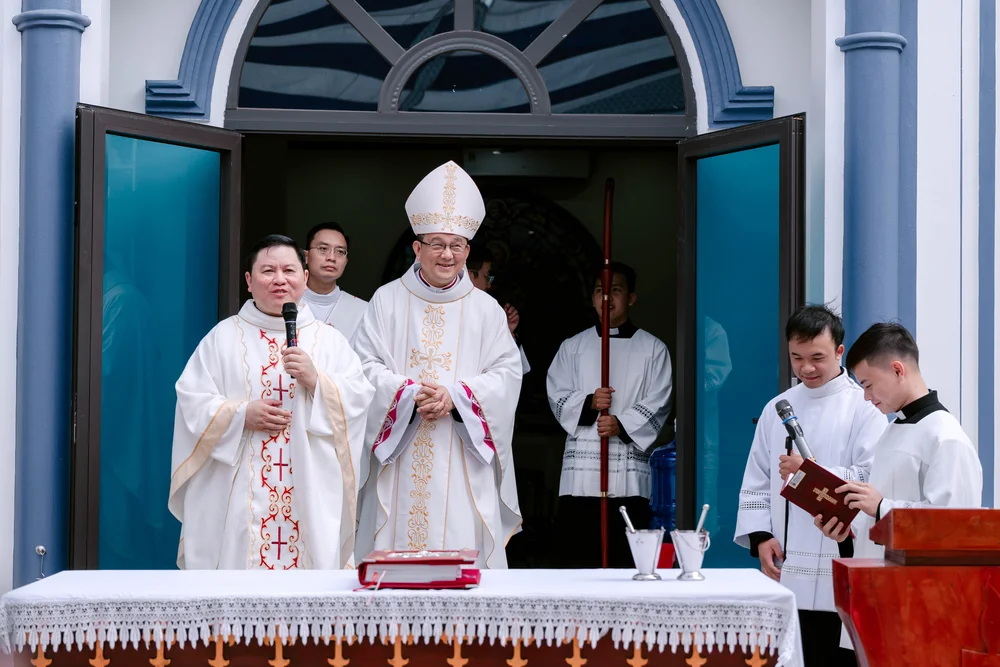 Trước khi bước vào Thánh lễ, Đức Cha Giuse đã chủ sự nghi thức làm phép Nhà giáo lý – công trình được xem như mái nhà đào tạo đức tin cho mọi thành phần Dân Chúa. Tiếp đó, đoàn rước long trọng tiến vào ngôi nhà thờ, trong tiếng kèn đồng vang vọng.