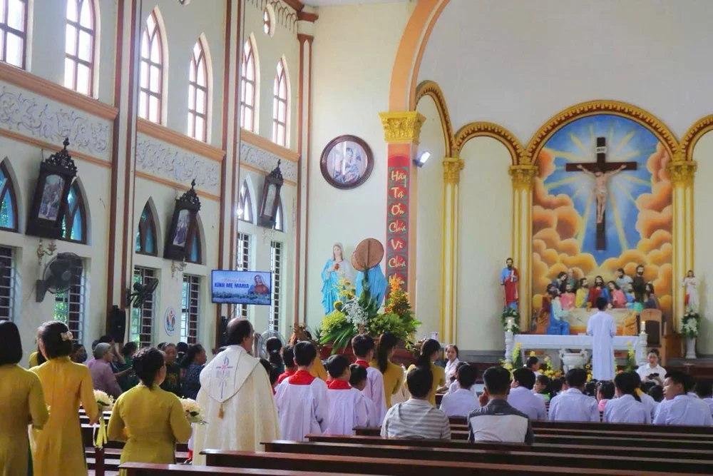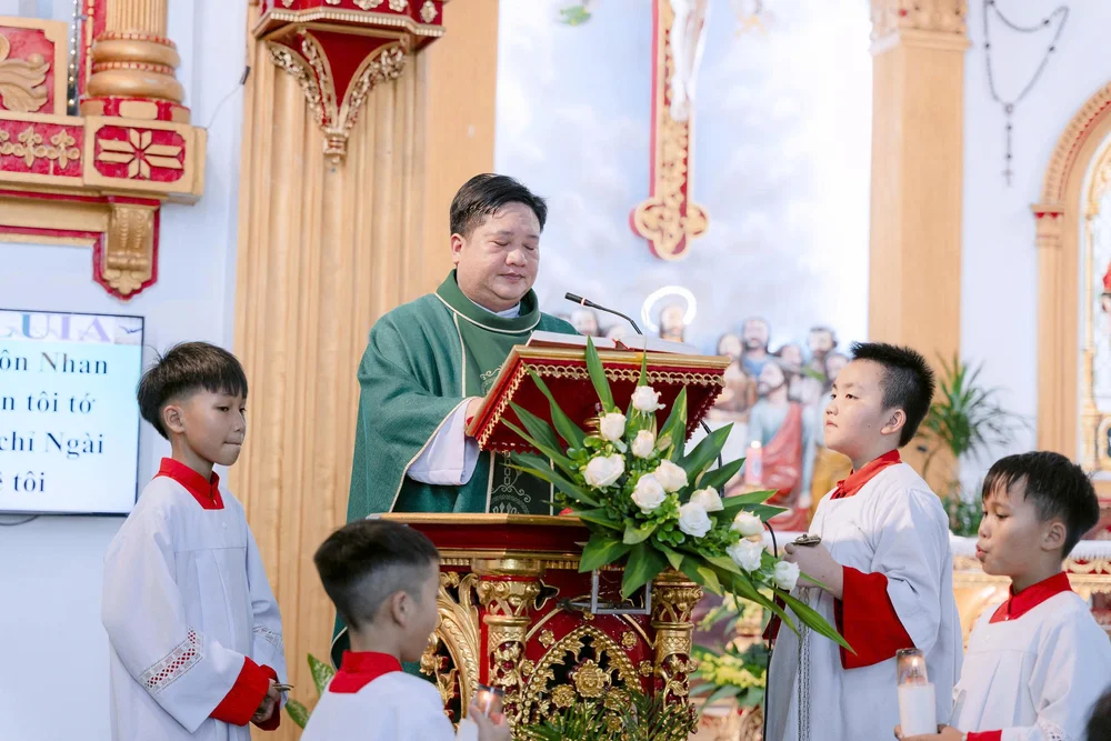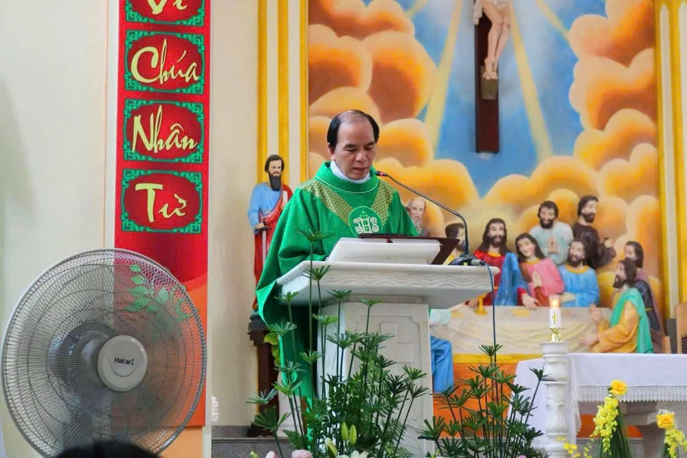 Thánh lễ do Cha phó An-rê Dũng Lạc Maria Nguyễn Văn Bình chủ sự. Trong bài giảng, cha An-rê khởi đi từ hình ảnh sự đổi thay nơi thiên nhiên và thân xác con người để mời gọi cộng đoàn cũng biết can đảm từ bỏ, biến đổi bản thân, sống quảng đại và dấn thân phục vụ gia đình, giáo xứ, giáo họ và xã hội. Cha nhấn mạnh: Đức Maria chính là mẫu gương sáng ngời của sự tín thác và hiến dâng, để mỗi người biết noi theo trong đời sống hằng ngày.