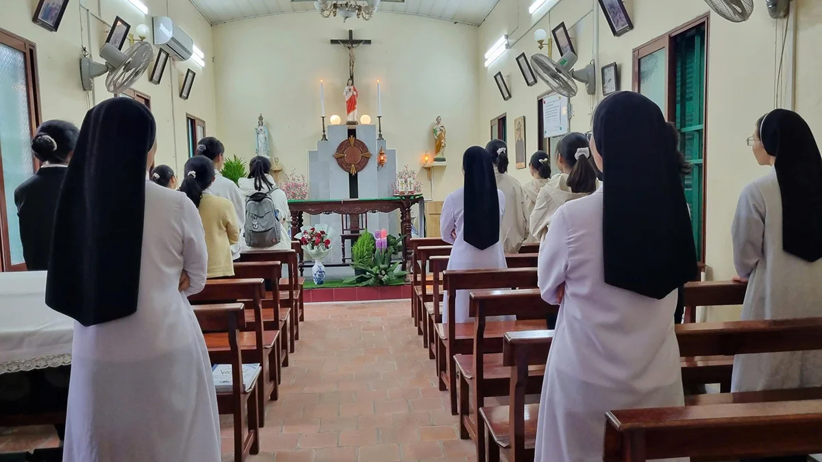 Nhóm quý dì Học viện Sứ vụ và khấn trọn đã ở lại bên Chúa Giêsu Thánh Thể trong giờ chầu tạ ơn tại nhà nguyện nhỏ bé của Tu viện. Trong thinh lặng sâu lắng, chị em dâng lên Chúa lời cầu nguyện cho Hiệp Hội và cho thế giới – một thế giới đang rất cần ánh sáng, bình an và sự chữa lành từ Thánh Thể.