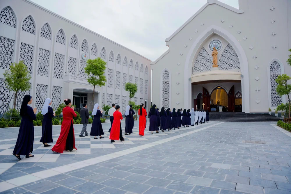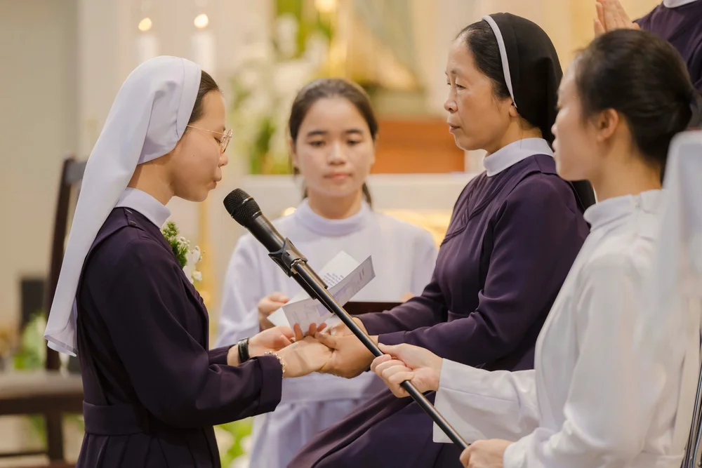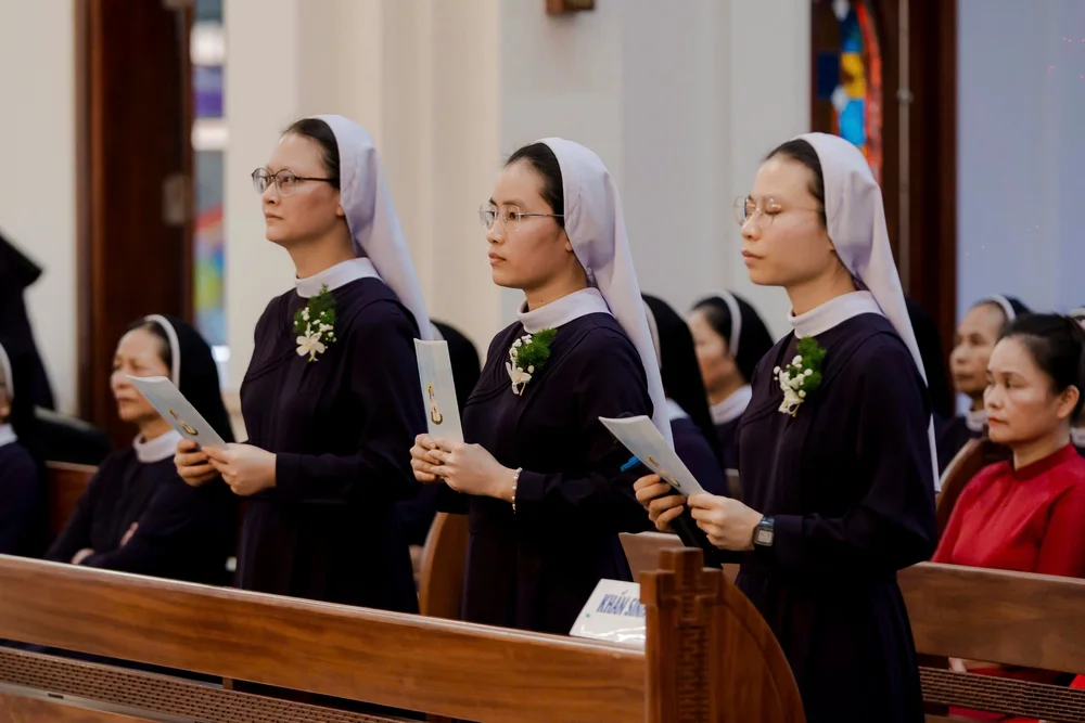 Sau lời khấn là nghi thức trao Khăn lúp – dấu chỉ bên ngoài của tình yêu trọn vẹn và lòng tận hiến sâu xa. Tấm khăn ấy không chỉ là y phục thánh thiện, mà còn là lời tuyên xưng sống động: từ nay, người nữ tu chọn Đức Kitô làm Lang Quân duy nhất, sẵn sàng từ bỏ mọi quyến luyến trần thế để sống đơn sơ, khiêm nhường và phó thác trọn vẹn cho Tình Yêu Cứu Độ.
