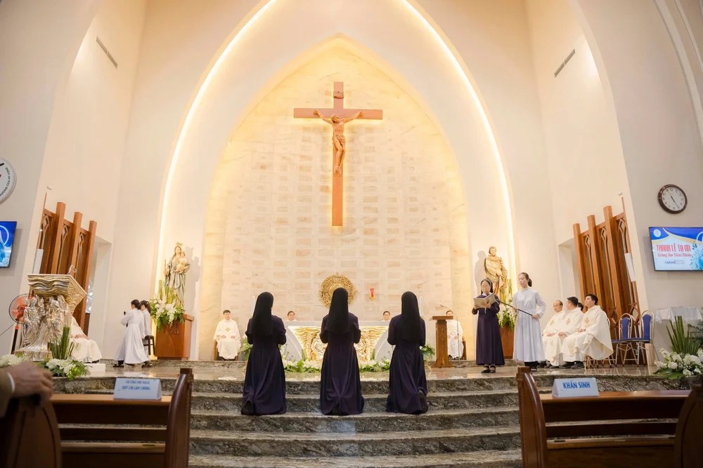 Khởi đầu Thánh lễ, lời ca nhập lễ cất lên trong tâm tình sốt sắng, dẫn đưa cộng đoàn vào bầu khí trang nghiêm và thánh thiêng. Bên ánh nến lung linh, ba Tập sinh tiến lên cung thánh trong tấm lúp trắng tinh khôi, biểu tượng cho tâm hồn trong sáng và trọn vẹn hướng về Thiên Chúa – Đấng mà các chị chọn làm Tình Quân duy nhất của đời mình.