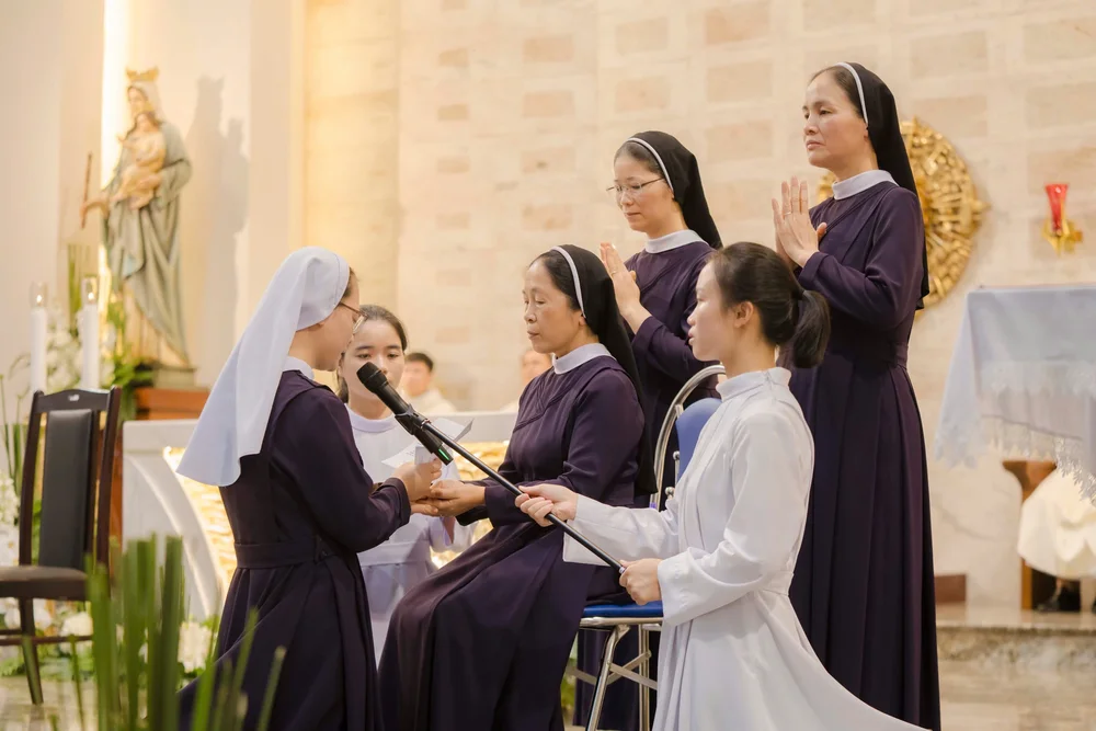 Sau bài giảng, cộng đoàn bước vào nghi thức tuyên khấn, giây phút linh thiêng nhất, ghi dấu một khởi đầu mới trong đời sống ơn gọi. Cha chủ tế long trọng thẩm vấn các ứng sinh về ý hướng và quyết tâm dâng hiến. Với tâm tình tự nguyện và xác tín, từng chị đã công khai bày tỏ lòng ưng thuận, sẵn sàng hiến dâng trọn vẹn cuộc đời để phụng sự Thiên Chúa và phục vụ tha nhân trong tinh thần yêu thương và khiêm hạ.