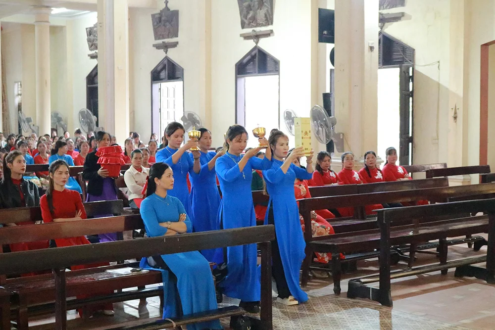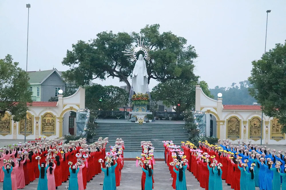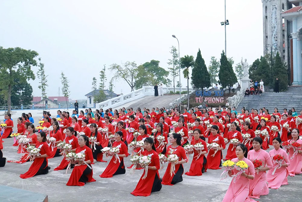 Tiếp đến, quý chị em Mân Côi cùng tiến hoa lên Đức Mẹ trong trang phục áo dài truyền thống và làn điệu quan họ.