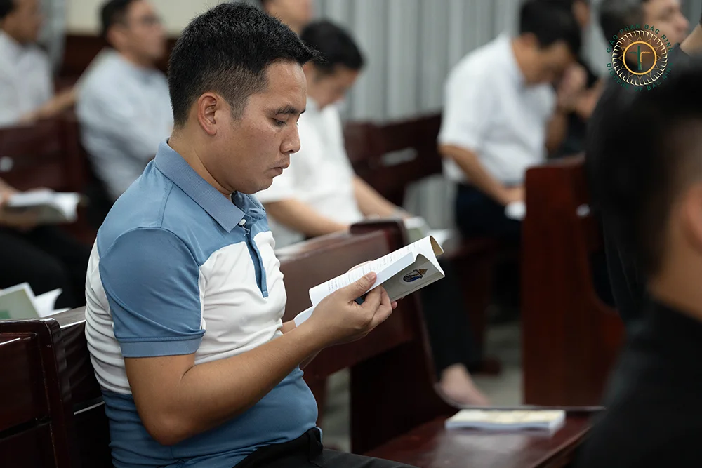 Sau giờ kinh Trưa giờ Chín, với sự hướng dẫn của Chúa Thánh Thần, quý cha đã bắt đầu vào giờ khai mạc tĩnh tâm đầu tiên. Bối cảnh của tuần tĩnh tâm năm nay là những dòng chảy của Giáo Hội Hoàn Vũ: Thượng Hội Đồng Giám Mục thế giới về Hiệp Hành, tông huấn đầu tiên của Đức Thánh Cha Lê-ô; Thư Chung của Hội đồng Giám Mục Việt Nam và khuôn mặt một vị thánh trẻ, cháy hết mình với Chúa Giêsu Thánh Thể, quảng bá hết mình về Thánh Thể. Từ bối cảnh đó, Quý cha được mời gọi đặt mình trong tuần hồi tâm để trả lời câu hỏi linh mục là ai?