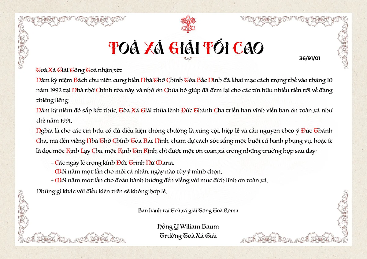 Toà Xá Giải Tông Toà đã ban Ơn toàn xá cho những người viếng Nhà thờ Chính toà Bắc Ninh vĩnh viễn (không thời hạn). Dưới đây là nguyên văn: