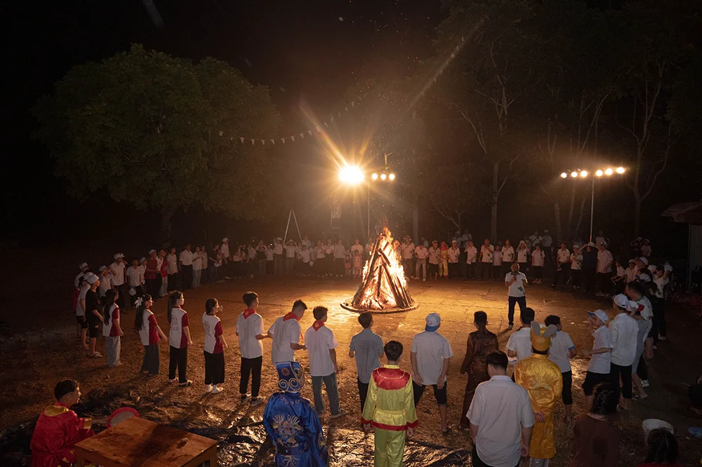 Sau Thánh lễ, các bạn trẻ cùng nhau chia sẻ niềm vui trong bữa cơm huynh đệ, đậm tình gia đình giáo xứ. Buổi tối tiếp nối với chương trình nghi thức đốt lửa thiêng. Dù trời đổ mưa nặng hạt, nhưng ngọn lửa vẫn bừng cháy, biểu tượng cho tinh thần nhiệt huyết và dấn thân của giới trẻ trên hành trình đức tin. Cao điểm của đêm sinh hoạt là chương trình diễn nguyện do các bạn trẻ dàn dựng và thể hiện, nhằm tôn vinh đức tin và gương sống anh dũng của thánh Quan Thầy.