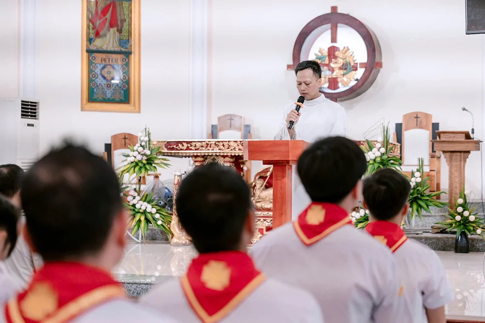 Dưới ánh sáng của Tin Mừng hôm nay, cha Tuyên úy Giuse mời gọi cộng đoàn, cách riêng các giáo lý viên và huynh trưởng, sống trọn trách nhiệm lời thề hứa, noi gương Thánh bổn mạng và các Thánh Tử đạo Bắc Ninh, để mảnh đất Kinh Bắc tiếp tục trổ sinh hoa trái đức tin. Sau đó là nghi thức tuyên hứa của tân Ban Điều hành Liên Đoàn Giuse Hoàng Lương Cảnh nhiệm kỳ 2025-2028.