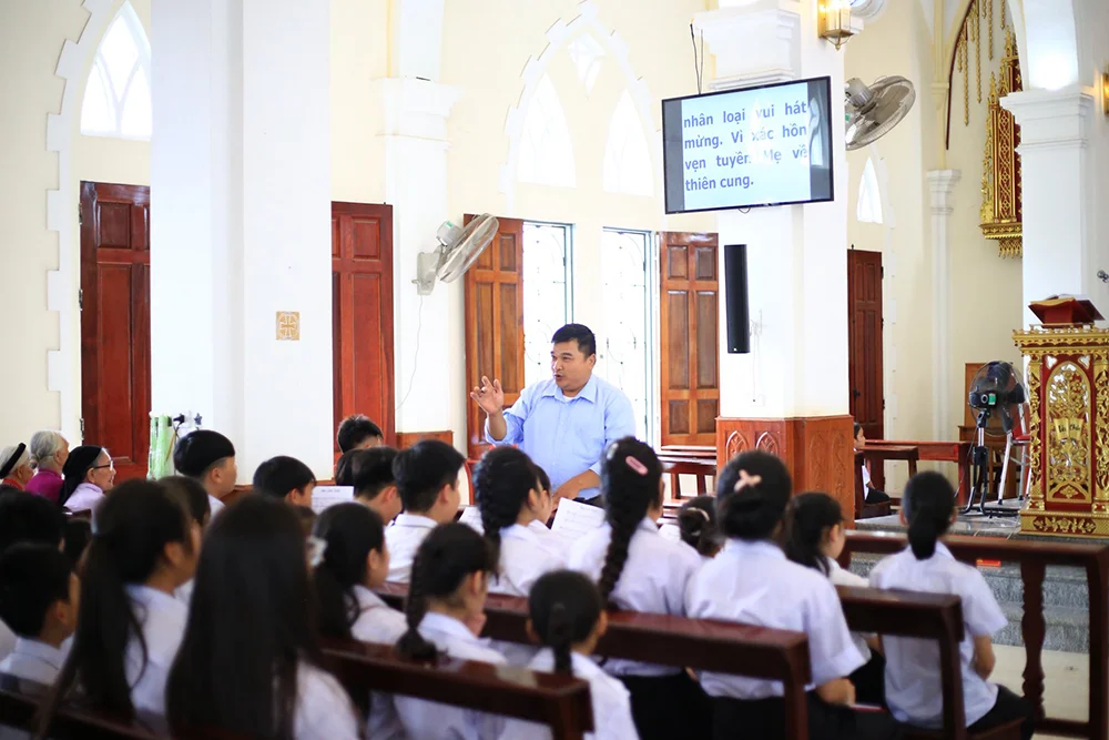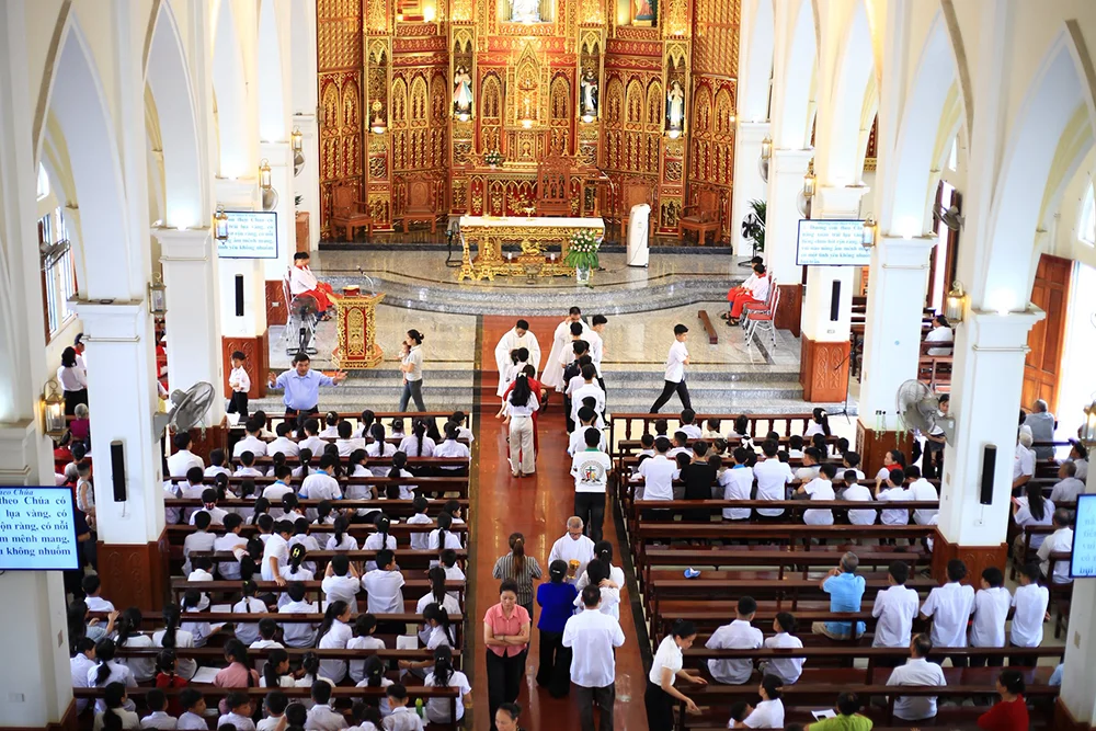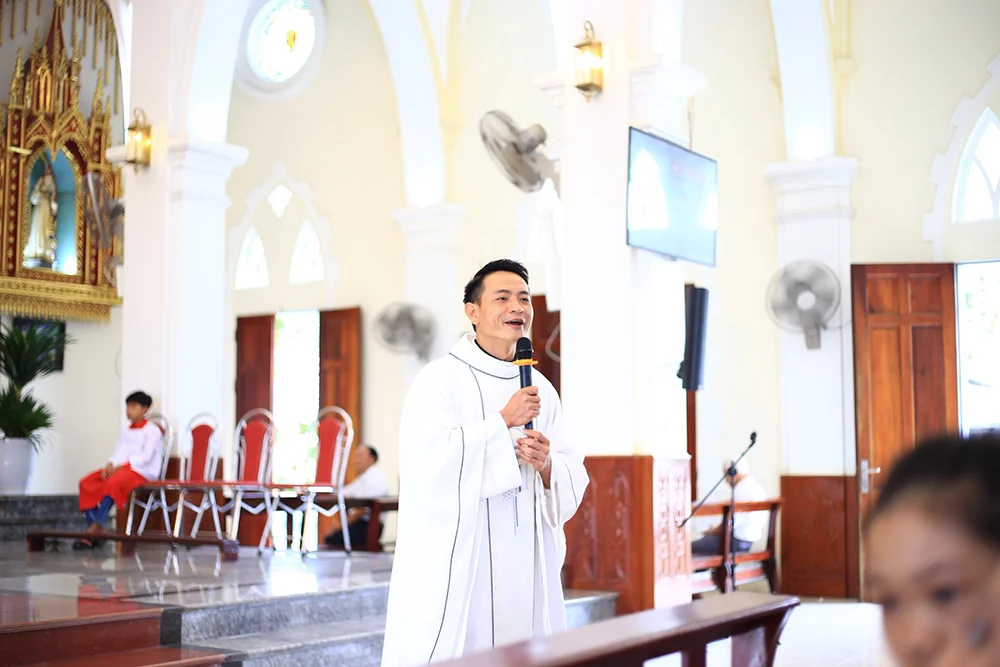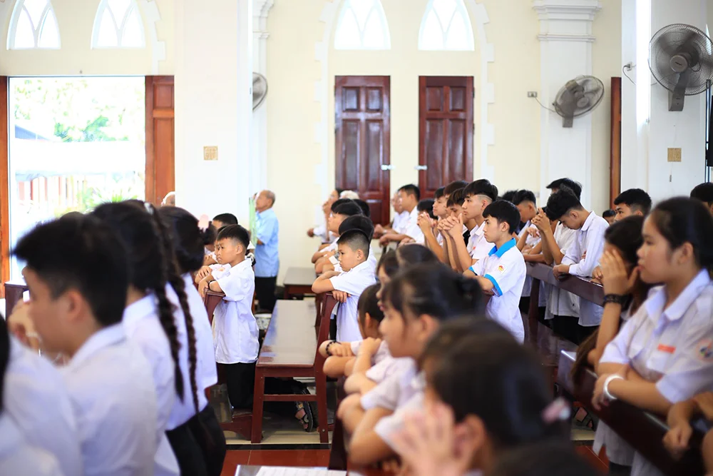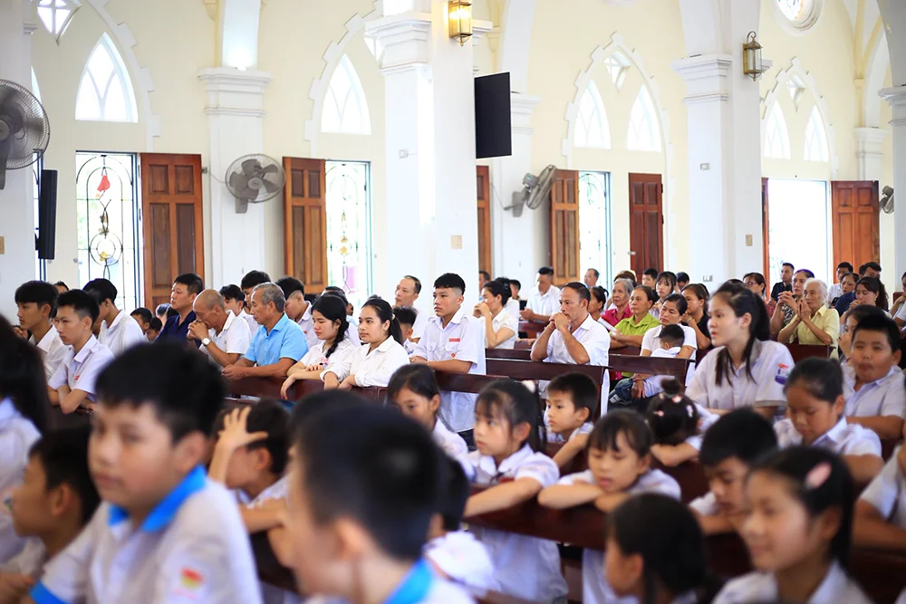 Đồng hành cùng các em có cha phó Giuse Trần Văn Tuyển, quý thầy, quý dì, các anh chị giáo lý viên và các bậc phụ huynh. Thánh lễ diễn ra lúc 15h00 do cha phó chủ tế, đồng tế có cha phụ tá giáo xứ Vân Cương.